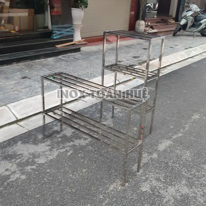 - Cấu tạo: 3 tầng làm từ nan ngang inox, mỗi tầng được thiết kế với các nan inox chạy ngang, mang lại sự thông thoáng và vững chắc cho kệ.