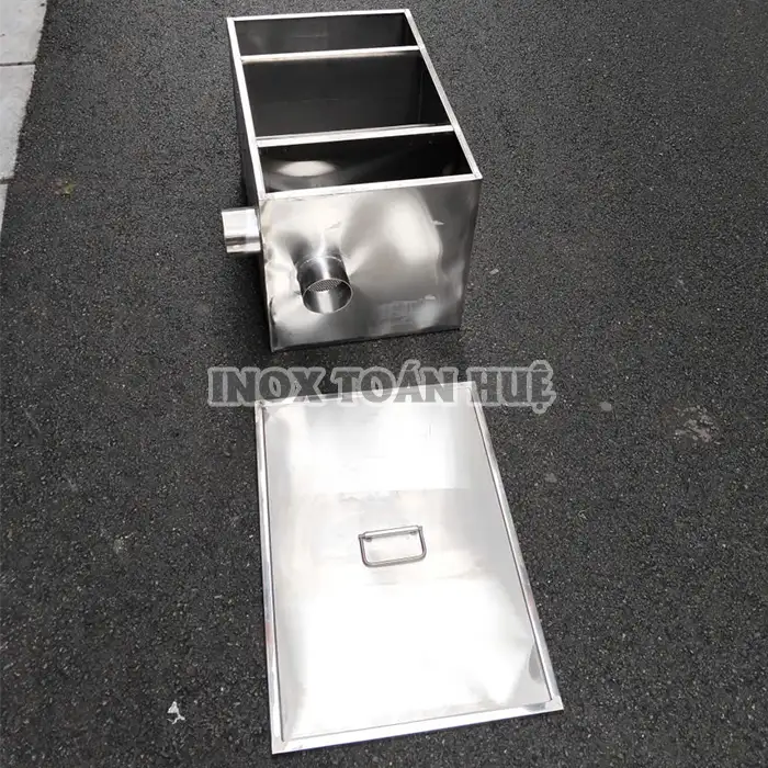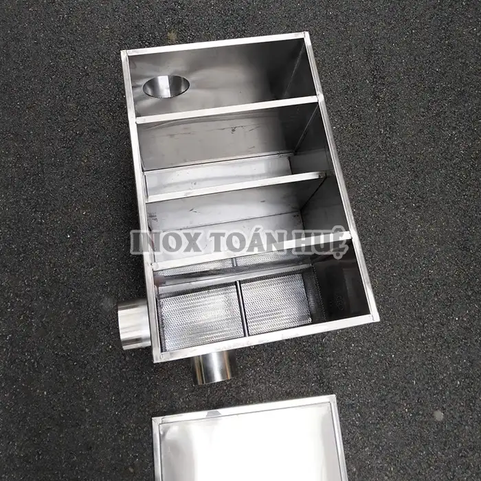 Có rổ lọc hoặc tấm lưới inox để giữ lại các rác thô, vụn thức ăn, cặn lớn, tránh trôi sang các ngăn sau.